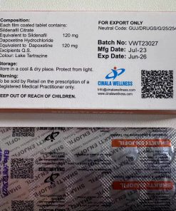 西地那非120毫克+達泊西汀120毫克對治療男性勃起功能障礙和早泄問題有效。 它是兩種藥物的組合,往往可以解決勃起困難的問題。 這是強烈推薦的獨特解決方案,有助於克服勃起困難的問題,該藥物還有助於延緩高潮過程,從而增強感官快感